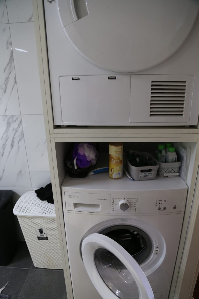 De keuken kan je op zijn minst “vintage” noemen maar is nog perfect bruikbaar. Er is een handige ingebouwde bergkast die genoeg plaats biedt om je voorraad en poetsspullen in op te bergen.