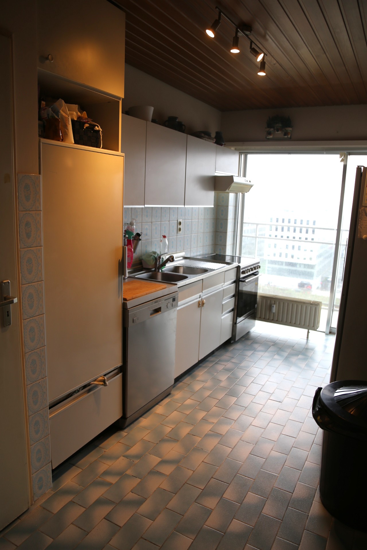 Via 1 van de ruime liften, kom je op de bovenste verdieping. Het appartement is deels gerenoveerd en open getrokken om het ruimtelijk gevoel nog te vergroten. De woonkamer is ruim met meer dan voldoende plaats om een grote tafel, een comfortabele zithoek en een extra gezellig hobby-/leeshoekje te installeren.