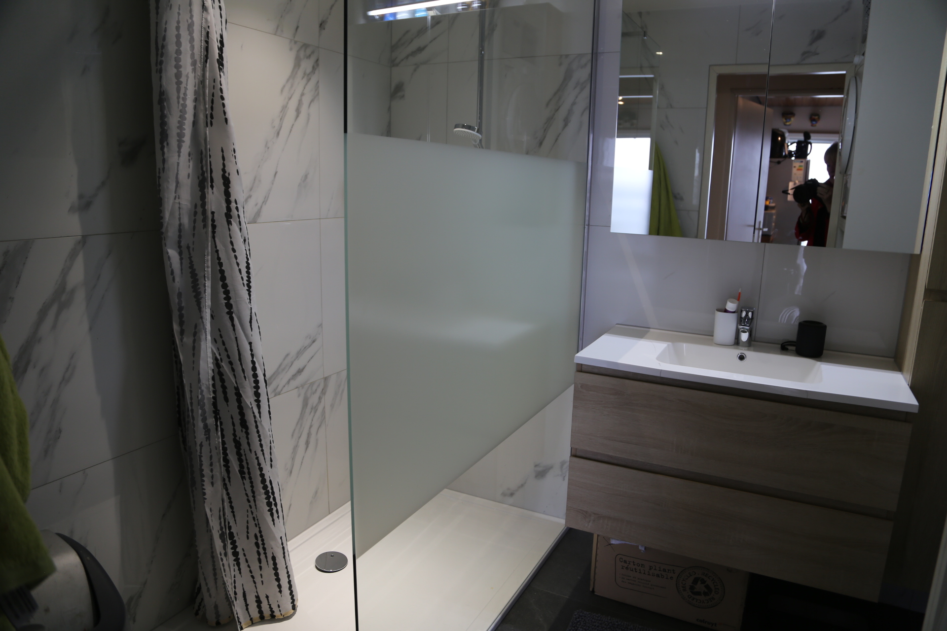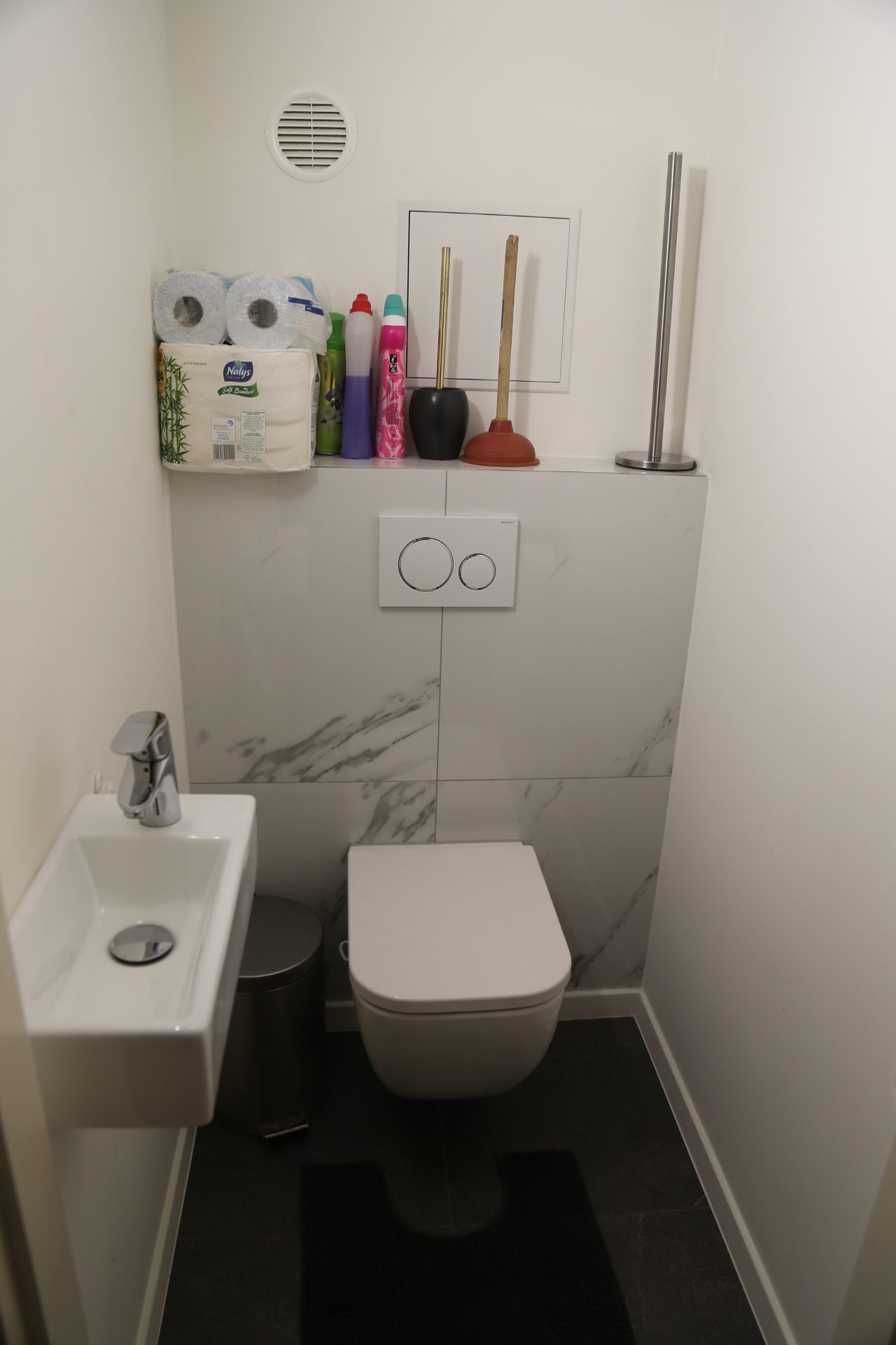 De vernieuwde badkamer heeft een comfortabele douche, een lavabo met kast en een plek om je wasmachine en droogkast te zetten. Het eveneens vernieuwde aparte toilet in de hal is een extra troef.